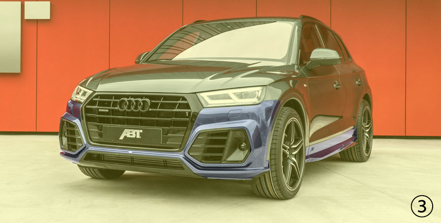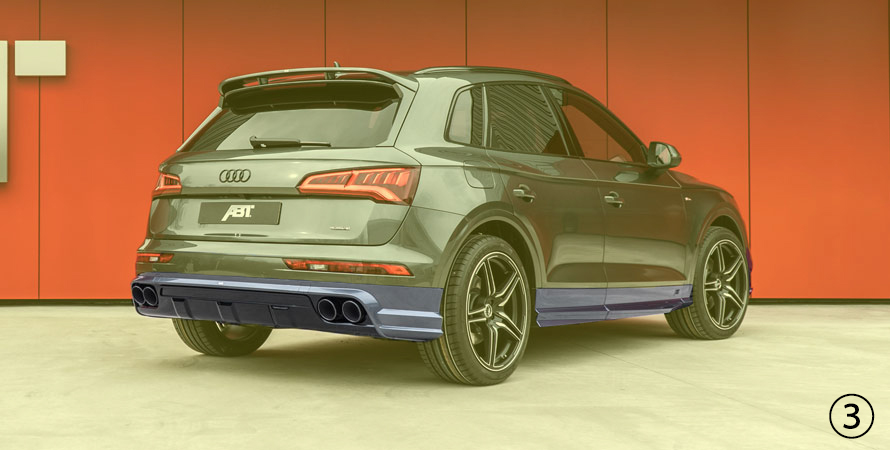 | 80A08006001 | ③ | ABT - AERO PACKAGE SLIM BODY | ABT Aero package / trim strips silver suitable for vehicles with 2.0 TFSI engines consisting of: · 80A08006110-1 ABT - front skirt · 80A08006260 ABT - door strip attachments · 80A08006130 ABT - rear skirt set incl. rear muffler and end pipes · 80A02006110 ABT - rear muffler and end pipes ABT rear wing can be installed additionally |